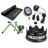 FREE DVD only available with the 2010 model trainer has 3- 30 minute Spinerval workouts: Lifetime Frame Warranty and motor warranty with a crash inclusion which allows you to receive replacement parts for any reason for $25 and shipping. FEATURES: Adjustable legs to accommodate BMX, Mountain and Road Bikes. Folds in half for easy storage. Non-marring PVC feet absorbs floor irregularities Robotically welded frame for strength and powder coated painted for extreme durability. Power-tap calibrated replicates power requirements of outdoor ride. 80 cooling fins to dissipate heat! 3 ounces of themaldynamically neutral liquid silicone provides quiet road-like resistance. Sealed fluid chamber with magnetic coupler for leakfree operation. 2 1/8" roller, Largest in the industry, extends tire life! Dynamically balanced flywheel provides a smooth ride, choose standard (3lbs) or Raod Machine (6.25lbs). Patented quick-release lever lock, speeds bike attachment and removal. Cone cups accommodate 99% of OEM skewers. Speed sensitive resistance unit automatically adjusts difficulty level from 20 to 2,500 watts. fits bikes with wheels from 16" to 29" O.D. FLOOR MAT: Its simple. Its functional. And the perfect accessory for a Kinetic trainer. The Kinetic Floor Mat. Reduces vibration. And keeps floors sweat-free. * Closed cell PVC foam * Noise-dampening material * Dimensions: 79" X 36.5" COMPUTER: The fluid trainer has an amazingly accurate power curve (power v speed). Combined with this Kinetic power computer, riders get accurate estimates of power output without a special hub, excess wires, or complicated gear calibration. Three-line display Current power in watts Average power in watts Maximum power in watts Current speed Power output only accurate when riding trainer. Average Speed Maximum speed Odometer / Total distance Trip distance Ride time Total ride time Clock Auto on / Auto off Sleep mode