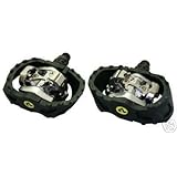 Dual-sided (30-degree pop-up) clipless engagement bindings. Adjustable cleat tension (uses SH51/SH56 cleats). Large resin cage accommodates non-cleated shoes. Replaceable resin outer cage assembly with a sealed, ball-bearing design.