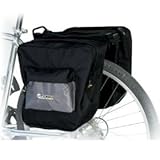 Sunlite Traveler 1 Bicycle Saddle Pannier Bag.4 compartments with heavy duty zippers and carrying handle, connected bags one on each side.4 compartments with heavy duty zippers and carrying handle, connected bags one on each side.Mounts on rear rack with compression straps.Dimensions: 12" x 10" x 5".